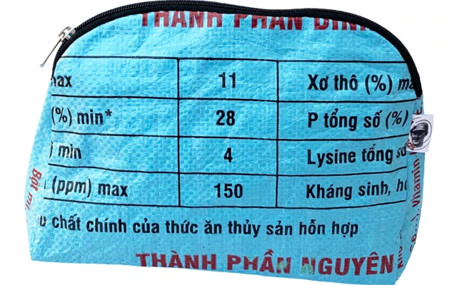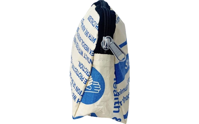 Das Reissackmaterial ist wasserdicht, leicht und strapazierfähig. Jede Kosmetiktasche ist ein Upcycling Einzelstück. Lässiges und cooles, unisexes Design.